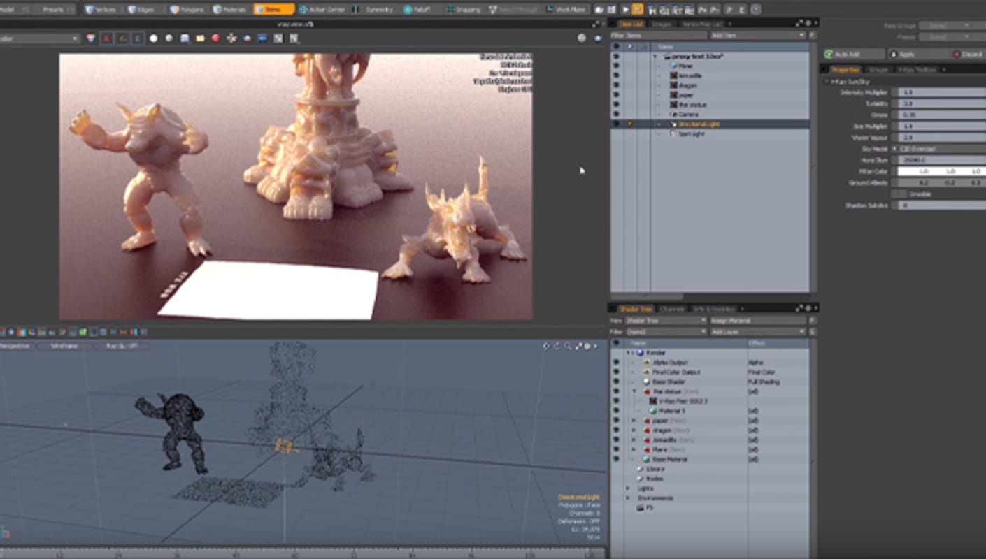 V-Ray for MODO는 MODO의 기본 조명 및 음영과 긴밀하게 통합되어 있어 시작하기가 쉽습니다. 모든 기존 조명 및 음영 설정은 Scene 뒤에서 V-Ray로 변환됩니다.